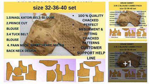 3 IN 1 Cambo Blouse Paper Farma Sheet Size Set Of 3 (32-36-40) With 4 Types Blouse Neck Designs 1. Pan Neck 2.Sweet Heart Neck 3. Matka Neck 4. Round Open Back Design