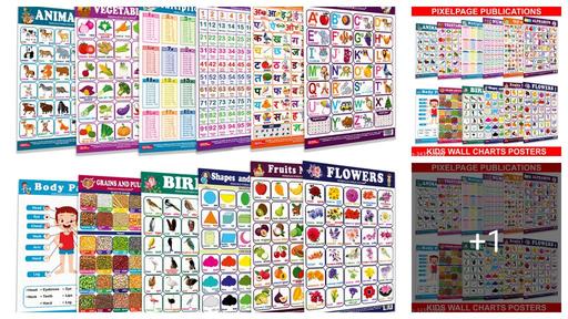 Complete Kids' Chart Set - 12 Educational Charts: ABCs, Hindi, Numbers, Fruits, Vegetables, Flowers, Multiplications, Shapes, Colours, Birds, Animals, Body Parts, Grains, Pulses - Explore, Learn, Grow
