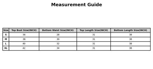 S (Top Bust Size: 36 in, Top Length Size: 31 in, Bottom Waist Size: 28 in, Bottom Length Size: 38 in)