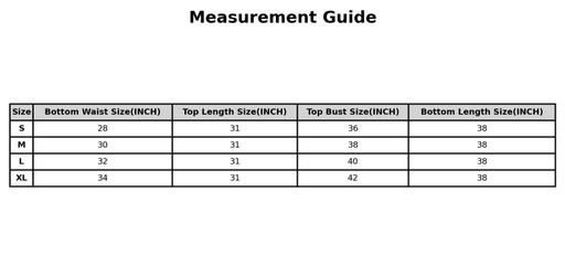 S (Top Bust Size: 36 in, Top Length Size: 31 in, Bottom Waist Size: 28 in, Bottom Length Size: 38 in)