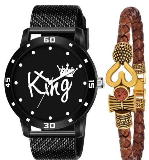 Name: BLACK STYLISH KING DIAL- PU STRAP WATCH & BROWN LEATHER TRISHUL BRACELET AND WATCH COMBO SET FOR MEN Analog Watch - For Boys