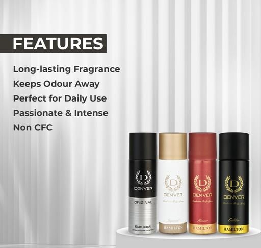 Denver Deodorant Body Spray For Men With A Carefully Blended Fragrance Mix And A Long Lasting Deo Protection Against Body Odors, To Keep You Delightfully Fresh And Confident Throughout The Day.The Essential Products You Need To Start Your Perfect Day With Freshness. Get The Wonderful, Smooth And Perfect Experience With Exclusive Range From A Renowned Brand Denver.All Day Fresh Deodorant For Men and Deodorant For Women. With Formula To Keep Your Skin Fresh Without Harming Them.