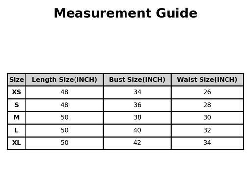 XXS, XS (Bust Size: 34 in, Length Size: 48 in, Waist Size: 26 in)