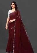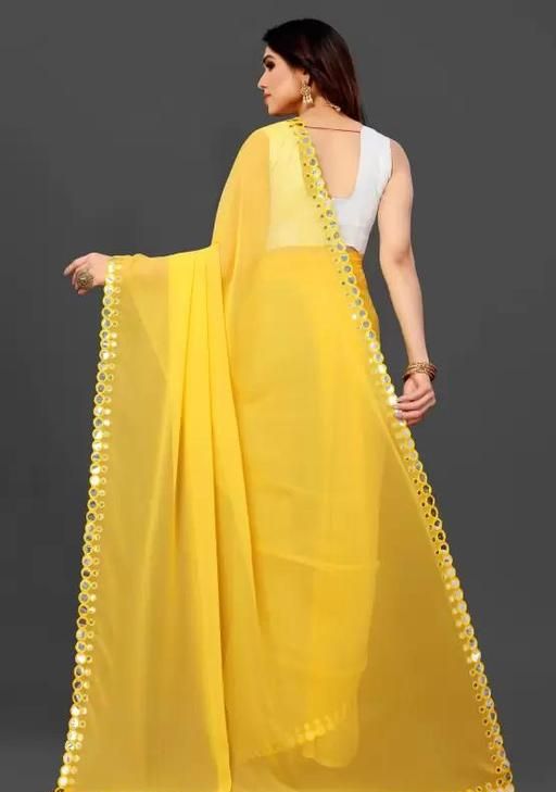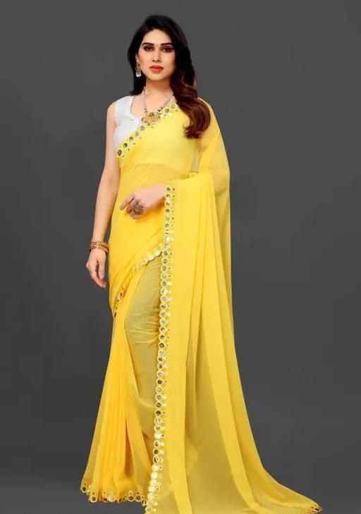 This is a Faux Georgette Plastic Mirror work Party Wear Saree.This Saree comes with an attached Art Silk blouse fabric which can be customised from 32" to 42