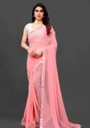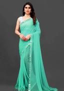 This is a Faux Georgette Plastic Mirror work Party Wear Saree.This Saree comes with an attached Art Silk blouse fabric which can be customised from 32" to 42