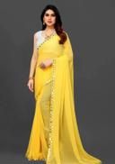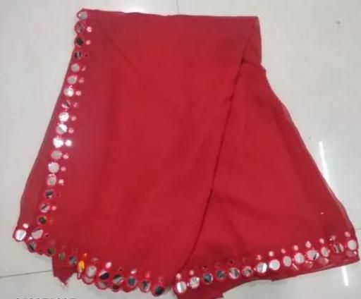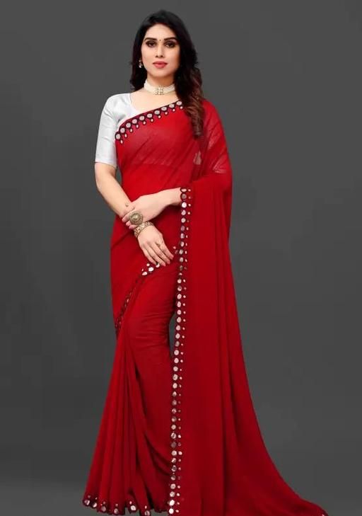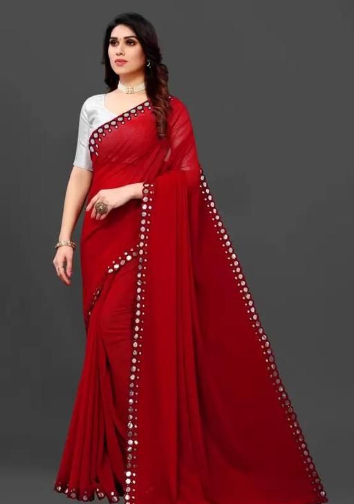 This is a Faux Georgette Plastic Mirror work Party Wear Saree.This Saree comes with an attached Art Silk blouse fabric which can be customised from 32" to 42