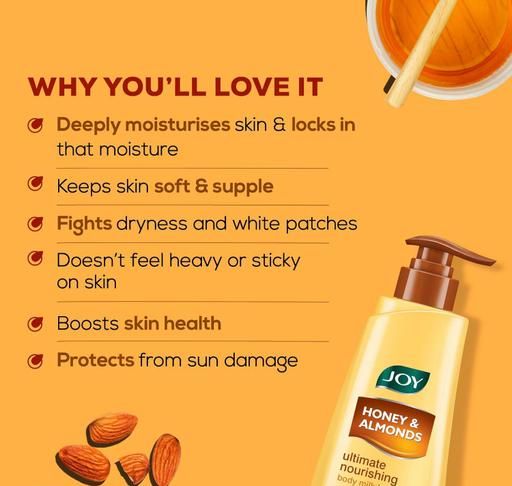 Is your skin feeling rough? Say hello to Joy Honey & Almonds Ultimate Nourishing Body Lotion. The Joy body lotion is a moisturiser which is effective for extremely dry skin, providing deep nourishment and moisturisation. This nourishing body milk moisturises the skin for long hours leaving it feeling soft and supple. This extremely nourishing body lotion has a rich, creamy texture that intensely hydrates skin while absorbing quickly without the greasy after feel.The Joy skin care product also reduces fine lines and wrinkles. It helps improve firmness and elasticity of the skin, skin glows with health and vitality. Disclaimer : All pictures shown here are for illustrative purposes only. The color in the image may vary slightly with the actual color of the product.