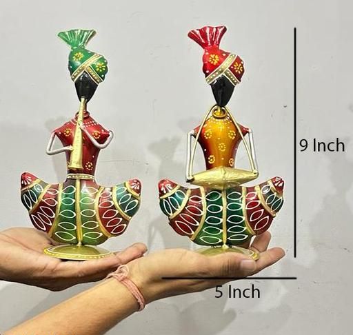The Iron Indian Handmade Hand Painted Showpiece set of 2 is a beautiful and unique piece of home decor, perfect for adding a touch of elegance and sophistication to any living space. This showpiece is handcrafted by skilled artisans from India, using traditional techniques that have been passed down through generations. Made from high-quality iron, this showpiece is sturdy and durable, ensuring that it will last for years to come. The intricate detailing and expert craftsmanship of the piece are evident in the finely sculpted features, from the intricate designs on the clothing to the lifelike expressions on the faces. The showpiece is also hand-painted, adding a vibrant and colorful touch to its already stunning design. The vibrant colors and intricate patterns are inspired by traditional Rajasthani decor, adding a touch of India's rich cultural heritage to any home. This Iron Indian Handmade Hand Painted Showpiece is perfect for displaying in a living room, bedroom, or any other room in your home. It can also make an excellent gift for housewarming or Diwali celebrations, as well as for any other special occasion. Whether you are a collector of Indian handicrafts, a lover of metal figurines, or simply looking for a beautiful and unique piece of home decor, this Iron Indian Handmade Hand Painted Showpiece is sure to impress. Its beautiful design and exquisite craftsmanship . #