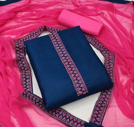A blue color top paired with pink color bottom and a matching dupatta is a stylish and elegant suit & dress material choice.A very comfortable and quality cotton fabric suit and dress for women's.We also put embroidery lace in top and duppata which makes your dress a good and nice look.