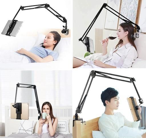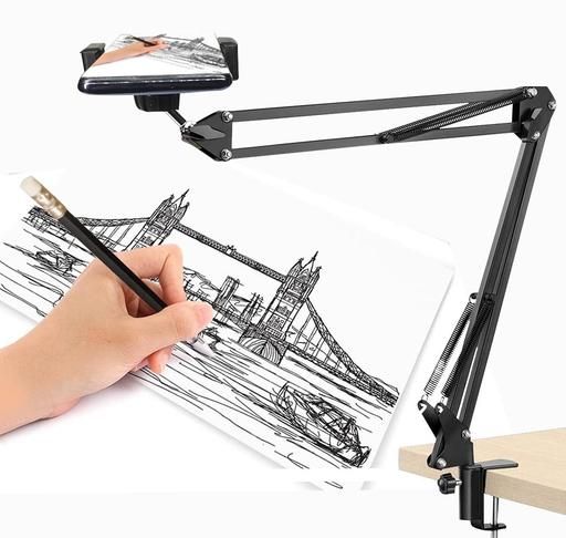 This mobile stand is made of Steel, which has a high level of quality, durability, and strength. By adjusting the lower base clamp to any edges, you can easily install it on any racks or edges of a Bed, Kitchen, Desktop Table, Office Table, and so on. The mobile mount and tablet mount brackets can be rotated 360 degrees to adjust the angle. Any mobile phone with a width of up to 3.1 inches or 8 cm and any tablet with a width of up to 21cm or 5.5 inches can be easily attached. Charge your phone or tablet while recording videos. Each joint has a 360-degree angle adjustment feature. Base Clamp- It can be mounted on any edge of the bed, study/drawing tables, kitchen racks, and other similar surfaces. The entire upper portion of the over head tripod can be rotated 360 degrees horizontally from its axis. Tight and Lose Knob/Key - This tight and loose knob key is provided at each joint to allow you to adjust any angle of your video shooting needs.