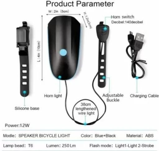 1. The speaker bicycle light with 140 dB horn. A independent switch. It has 5 different kinds of sounds. You can long press the speaker switch for 5 seconds to change the sounds, when you listen to the sound what you wanna, you loose your finger, that it is successful for your set up. 140db bicycle horn is super loud to attract passer-by and vehicles.