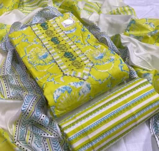 Top fabric- soft cotton cut-2.35 Mtr. Bottom fabric- soft cotton cut-2.10 Mtr. Chiffon Duptta fabric- Cotton -2.25 Mtr. Indian Traditionally hand block printed suit with Dupatta Dress material. The best part of buying unstitched dress materials is that you can choose the design by yourself, and enhance the appeal of an outfit.This dress material is made of soft cotton. The soft and smooth touch and skin-friendly properties of this fabric make it a perfect fit for every occasion.
