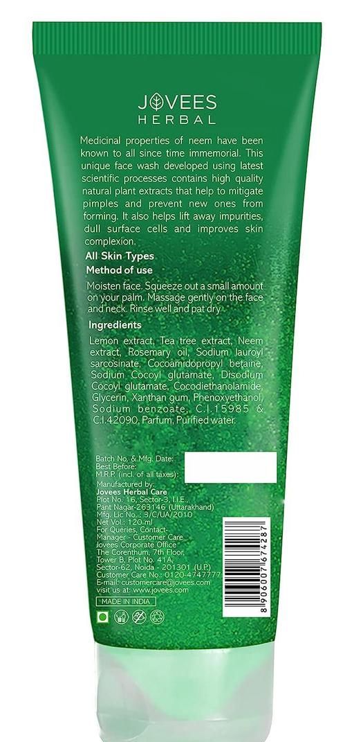 Product Name: Jovees Herbal Neem Face Wash With Neem & Tea Tree Extracts | For Oily & Acne Prone Skin | Oil Control , Remove Impurities , Prevents Pimples | For Men & Women 120ml