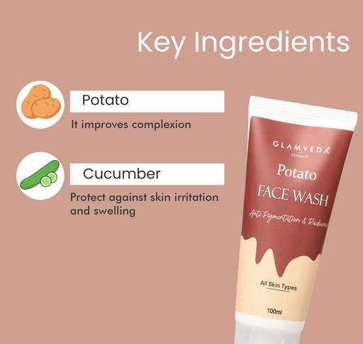 Glamveda Potato Anti Pigmentation Face wash is enriched with potato extracts. Potatoes are rich in nutrients like vitamin C, vitamin B1,B3, B5, and minerals like magnesium, potassium, phosphorus, and antioxidants and beta carotene. Potato extracts evens out skin tone, reduces hyperpigmentation, helps tighten open pores and boost collagen synthesis for a smooth, even tone and plum skin texture.