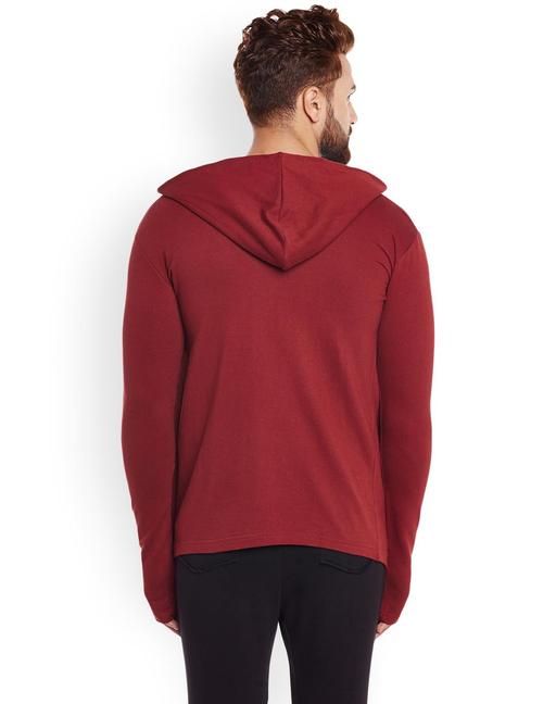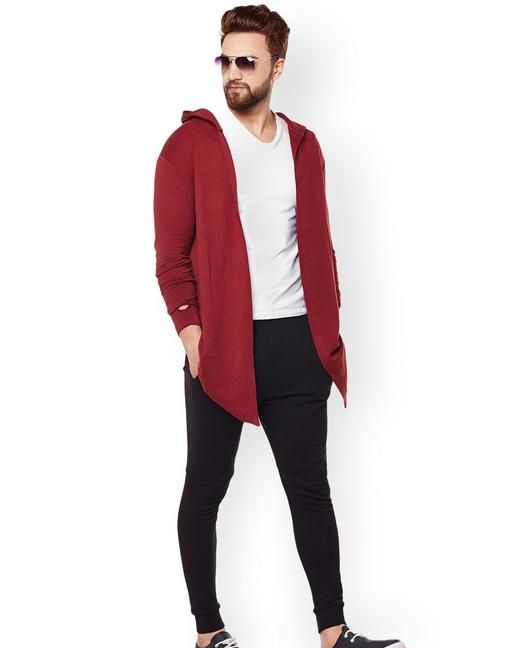 Name: GLAMPANDA Men Mehroon Hooded Thumbhole Open Long Cardigan Shrug Men's Stylish Solid Cotton Square Neck Collar Full Sleeves Cardigan/Shrug