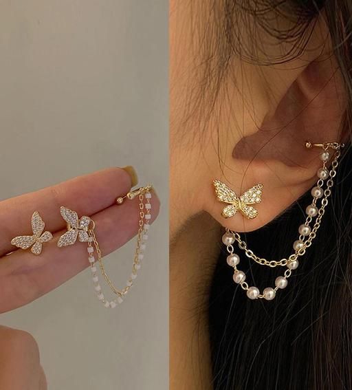 Korean Pearl Chain Ear Cuff Butterfly Stud Earrings For Women/Girls