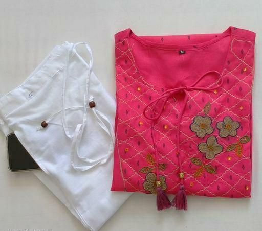 Name: Woman's Rayon Kurti With Palazzo Kurta Fabric: Rayon Bottomwear Fabric: Rayon Sleeve Length: Three-Quarter Sleeves Set Type: Kurta With Bottomwear Bottom Type: Pants Pattern: Embroidered Net Quantity (N): Single Sizes: XS, S (Bust Size: 36 in, Shoulder Size: 14 in, Kurta Waist Size: 32 in, Kurta Length Size: 42 in, Bottom Waist Size: 32 in, Bottom Hip Size: 34 in, Bottom Length Size: 38 in) M (Bust Size: 38 in, Shoulder Size: 14 in, Kurta Waist Size: 34 in, Kurta Hip Size: 36 in, Kurta Length Size: 42 in, Bottom Waist Size: 34 in, Bottom Hip Size: 36 in, Bottom Length Size: 38 in) L (Bust Size: 40 in, Shoulder Size: 15 in, Kurta Waist Size: 36 in, Kurta Hip Size: 38 in, Kurta Length Size: 42 in, Bottom Waist Size: 36 in, Bottom Hip Size: 38 in, Bottom Length Size: 38 in) XL (Bust Size: 42 in, Shoulder Size: 15 in, Kurta Waist Size: 38 in, Kurta Hip Size: 40 in, Kurta Length Size: 42 in, Bottom Waist Size: 38 in, Bottom Hip Size: 40 in, Bottom Length Size: 38 in) XXL (Bust Size: 44 in, Shoulder Size: 16 in, Kurta Waist Size: 40 in, Kurta Hip Size: 42 in, Kurta Length Size: 42 in, Bottom Waist Size: 40 in, Bottom Hip Size: 42 in, Bottom Length Size: 38 in) XXXL (Bust Size: 46 in, Shoulder Size: 17 in, Kurta Waist Size: 42 in, Kurta Length Size: 43 in, Bottom Waist Size: 42 in, Bottom Hip Size: 44 in, Bottom Length Size: 38 in) 4XL (Bust Size: 48 in, Shoulder Size: 17.5 in, Kurta Waist Size: 44 in, Kurta Length Size: 43 in, Bottom Waist Size: 44 in, Bottom Hip Size: 46 in, Bottom Length Size: 38 in) 5XL (Bust Size: 50 in, Shoulder Size: 18 in, Kurta Waist Size: 46 in, Kurta Length Size: 43 in, Bottom Waist Size: 46 in, Bottom Hip Size: 48 in, Bottom Length Size: 38 in) Woman's Rayon Kurti With Palazzo Country of Origin: India