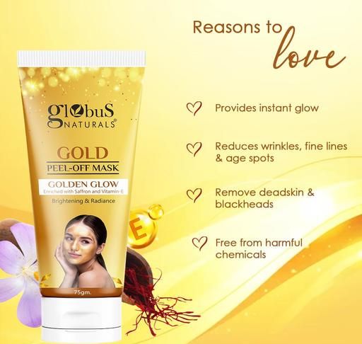 Product Name: Globus Naturals Gold Peel Off Mask For Golden Glow, Enriched with Saffron & Vitamin-E, Brightening & Radiance, Suitable For All Skin Types, 75 g (Pack of 3)