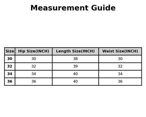 30 (Waist Size: 32 in, Length Size: 38 in, Hip Size: 30 in)