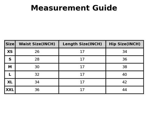XS (Waist Size: 26 in, Length Size: 17 in, Hip Size: 34 in)