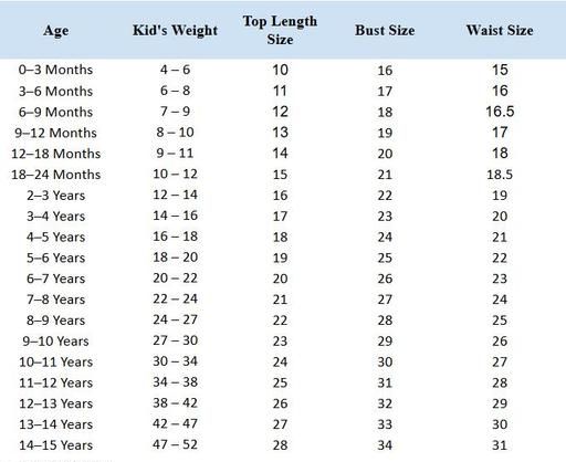 9-10 Years (Bust Size: 15 in, Length Size: 19 in, Waist Size: 14 in)