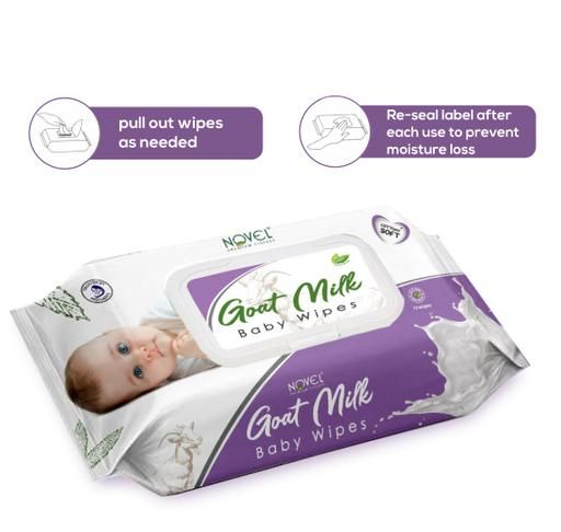 Novel Goat Milk Baby Wipes Made with Goat Milk. Soft and thick, they will cleanse as well as moisturise. Enriched with ingredients such as Goat Milk, Aloe Vera and Vitamin E, they are also Hypoallergenic and free from Parabens and Fragrance.