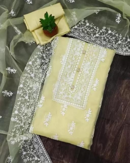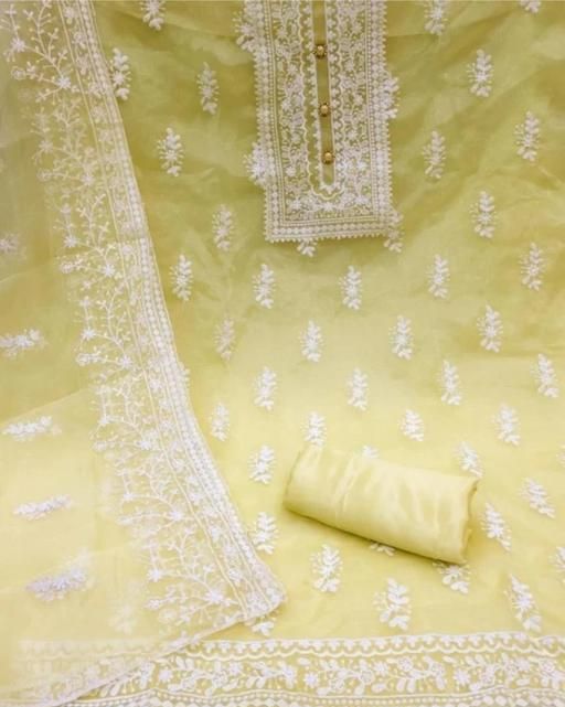 Name: Unstiched Exclusive Super Best Collections Organza Party Wear Fancy Patiala Pakistani jaipuri All Occastions Organza Suits Women's yellow Embellished Embroidered Organza Suits & Dress Materials