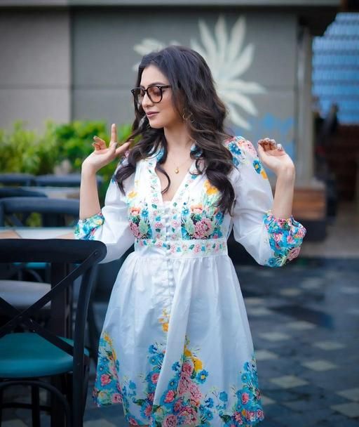 The dress is crafted from a lightweight and breathable fabric, such as cotton or chiffon, which offers ease of movement. The fabric is adorned with a multicolored floral print, featuring various flowers in vibrant hues. This floral pattern adds a touch of whimsy and femininity to the dress, creating a cheerful and eye-catching look.