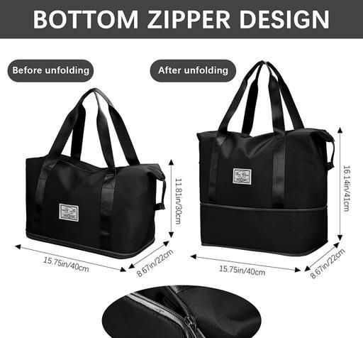 Large capacity folding travel bag made with lightweight waterproof and tear resistant Polyester fabric, solid, durable and strong enough to carry. It is enough for short trips and can easily accommodate 3-5 days of travel clothes.
