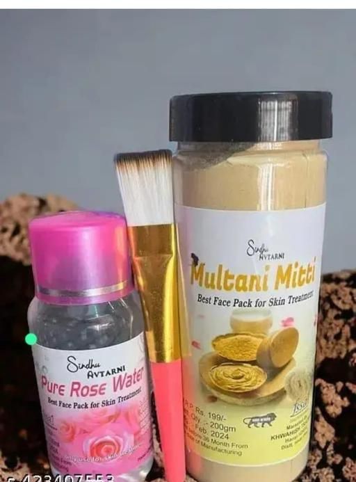 Name: Multani Mitti Face Pack Kit with Pure Rose Water and Applicator Brush - Complete Skincare Combo Product Name: Multani Mitti Face Pack Kit with Pure Rose Water and Applicator Brush - Complete Skincare Combo Brand Name: SINDHU AVTARNI Brand: SINDHU AVTARNI Flavour: Multani Mitti Net Quantity (N): 1 Skin Type: All Skin Types Type: Stick Capacity: 100-200gm name :- multani mitti face pack 200g. + Rose water 200 ml+Face Pack Combo offer Product Name Face Pack Mitti 200g + Rose water 200 ml+ Face Pack Brush offer Flavour : Rose Net Quantity (N) : 1 Skin Type : All Skin Types Type : Pressed Powder Capacity : 200-300gm Face Pack Mitti 200g + Rose water 200 ml+ Face Pack Combo offer Country of Origin : India More Information #PureRoseWater #NaturalSkinCare #GlowingSkin #HydratingToner #RoseWaterBenefits #FacePackMix #RefreshingSkinCare #AyurvedicFaceCream #GlowingSkin #NaturalSkincare #SkinBrightening #HerbalBeauty #MadeInIndia #ChemicalFreeCream #VisibleResults #TransformYourSkin Country of Origin: India