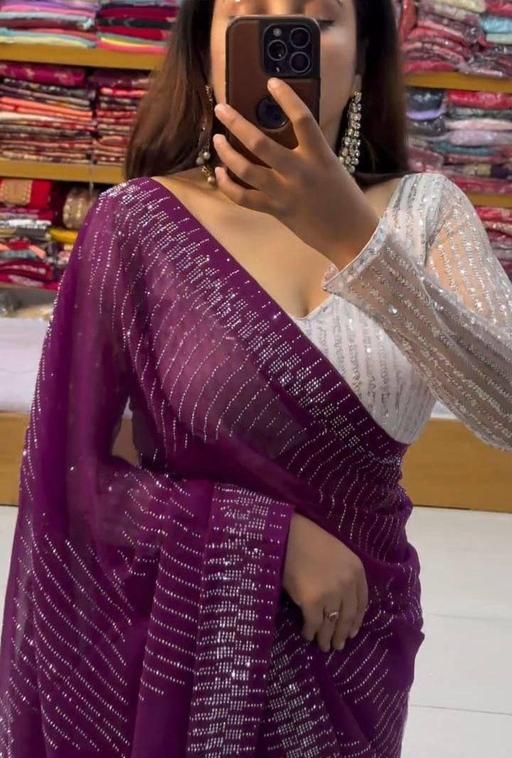 Purple Color Saree,Bollywood Georgette Saree,Siroski work Saree,Sequence Saree, Hotfix Diamond Saree With 1 Meter Sequence Embrodered Unstiched Blouse Piese.