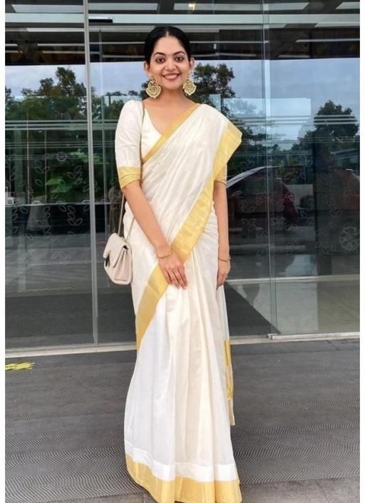 Name: White and gold-toned kasavu saree | Solid saree with zari border