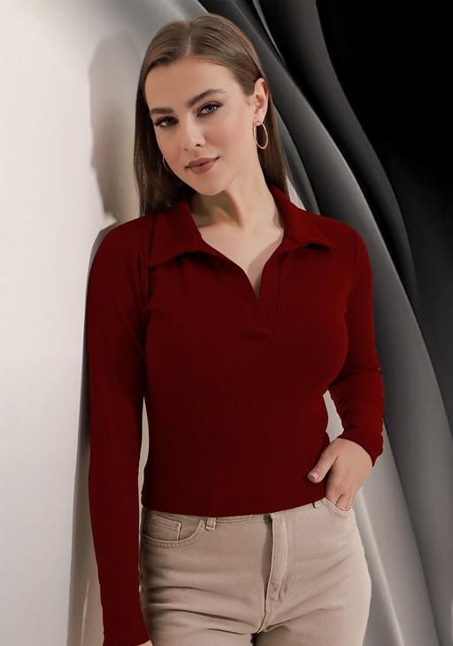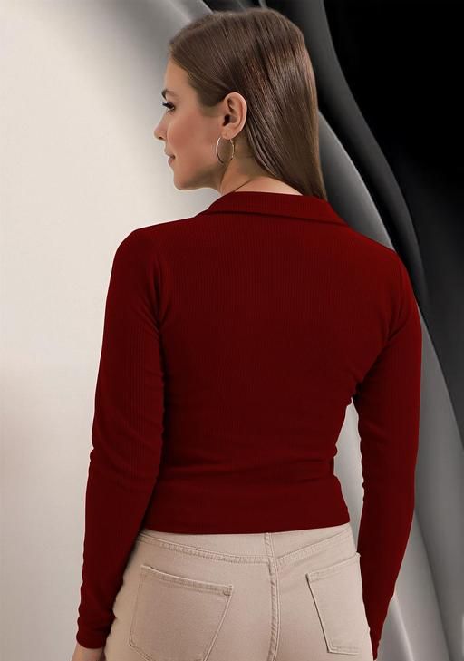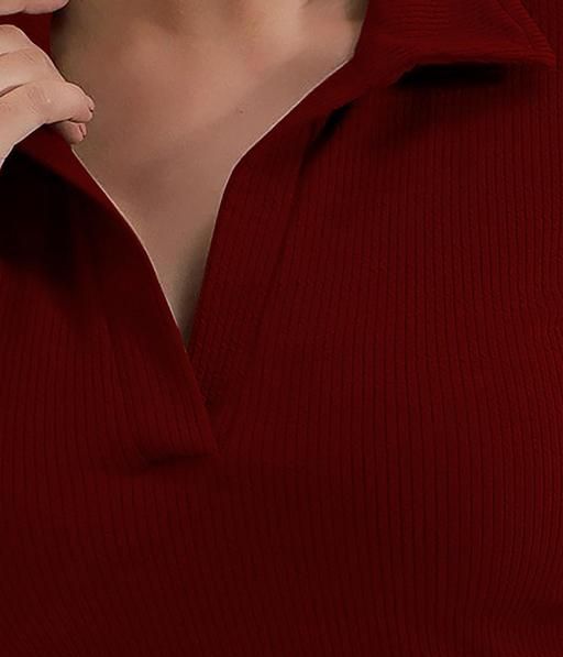 Name: Casual Polyester Blend Ribbed Collar V-Neck & Regular Long Sleeves Stylish Maroon Top (20"Inches)