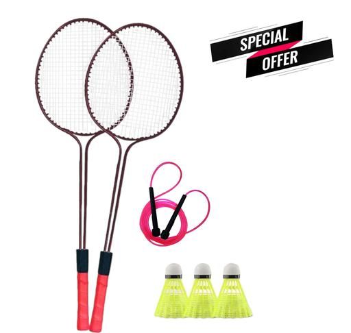 double rod badminton racket, badminton shuttlecocks, skipping rope, badminton combo, badminton gear, badminton equipment, sports gear, fitness gear, cardio workout, badminton accessories.