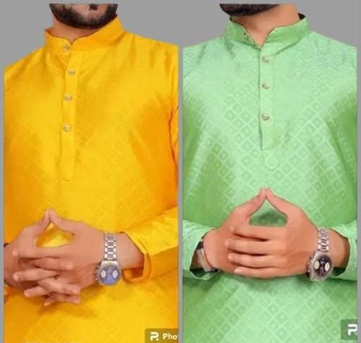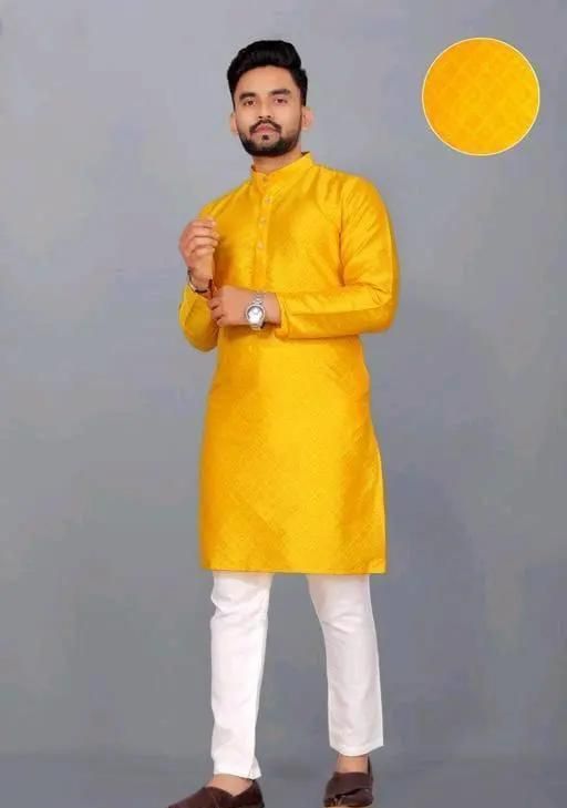 This amazing traditional wear Jacquard kurta has full-sleeves and button-down neckline that lends you the look of a debonair Indian men.Fit Type : Regular. Jacquard fabric with zari lining Ideal for all occasions and festivals. Ideal for Haldi, Mehandi, Ganpati, eid, Navratri, Diwali, Holi etc festivals. Ideal for wedding and reception. An ideal pick for traditional events and parties, this fashionable kurta has been designed to perfection with a banded collar for a dash of style and tailored from finest fabric. This kurta is a must have in a man's ethnic wardrobe. You can wear it with a jeans, Trousers for a classy yet understated look. It will augment your look and make you the centre of attraction at any occasion. Elevate your festive wardrobe with our Men's Cotton Regular Long Solid Kurta, a perfect blend of traditional elegance and modern style. This full-sleeved kurta is crafted from soft, breathable cotton fabric, ensuring all-day comfort. Featuring a classic mandarin collar and intricate embroidery, this straight-cut kurta exudes sophistication and is ideal for any Indian ethnic occasion. Whether you're attending a festive celebration or a cultural event, this embroidered kurta adds a touch of refinement to your look, making it a must-have for your ethnic wear collection.