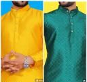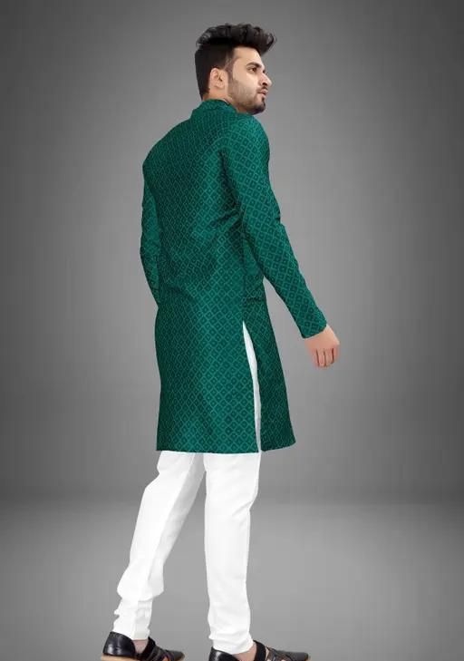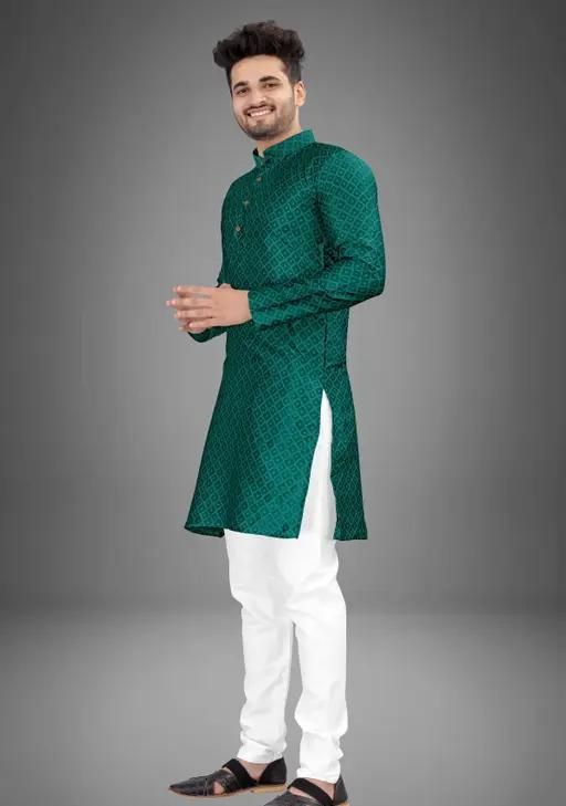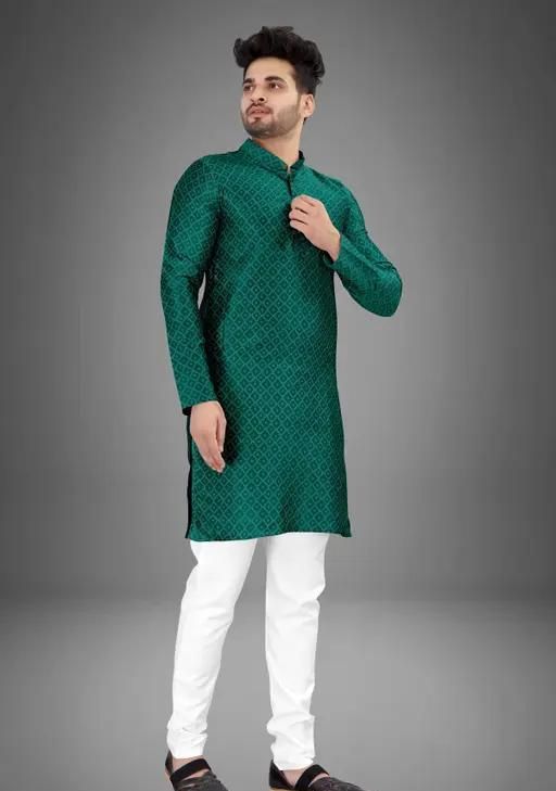 This amazing traditional wear Jacquard kurta has full-sleeves and button-down neckline that lends you the look of a debonair Indian men.Fit Type : Regular. Jacquard fabric with zari lining Ideal for all occasions and festivals. Ideal for Haldi, Mehandi, Ganpati, eid, Navratri, Diwali, Holi etc festivals. Ideal for wedding and reception. An ideal pick for traditional events and parties, this fashionable kurta has been designed to perfection with a banded collar for a dash of style and tailored from finest fabric. This kurta is a must have in a man's ethnic wardrobe. You can wear it with a jeans, Trousers for a classy yet understated look. It will augment your look and make you the centre of attraction at any occasion. Elevate your festive wardrobe with our Men's Cotton Regular Long Solid Kurta, a perfect blend of traditional elegance and modern style. This full-sleeved kurta is crafted from soft, breathable cotton fabric, ensuring all-day comfort. Featuring a classic mandarin collar and intricate embroidery, this straight-cut kurta exudes sophistication and is ideal for any Indian ethnic occasion. Whether you're attending a festive celebration or a cultural event, this embroidered kurta adds a touch of refinement to your look, making it a must-have for your ethnic wear collection.