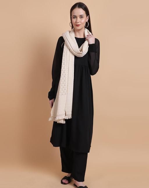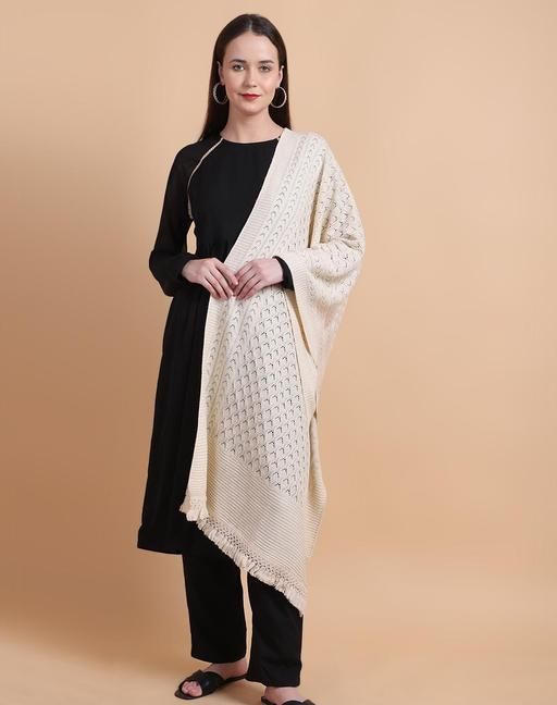 Name: Vesture Women's Winter Stole - Plain Self-Design, Luxurious Knitted Fabric, 28x80 Inch with Tassels (Cream)