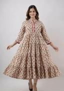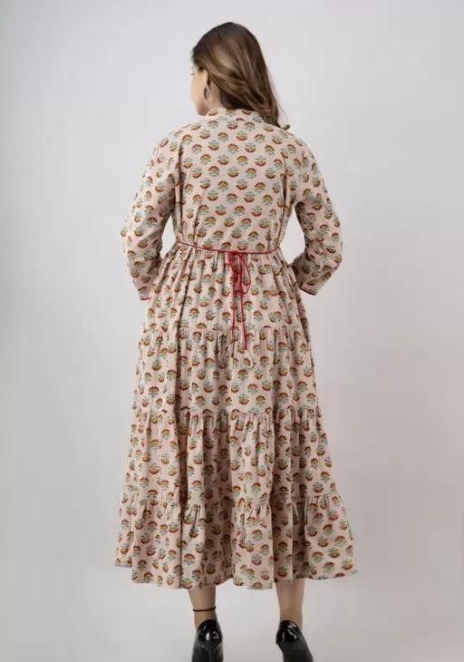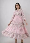 Crafted from soft, breathable fabric, this maxi dress ensures all-day comfort. The tiered silhouette and gathered waist enhance the feminine appeal, while the three-quarter sleeves with contrasting trim add a touch of sophistication. The V-neckline with subtle piping detail adds a stylish element, making it suitable for various occasions.