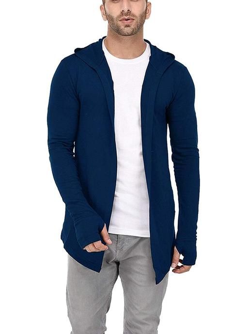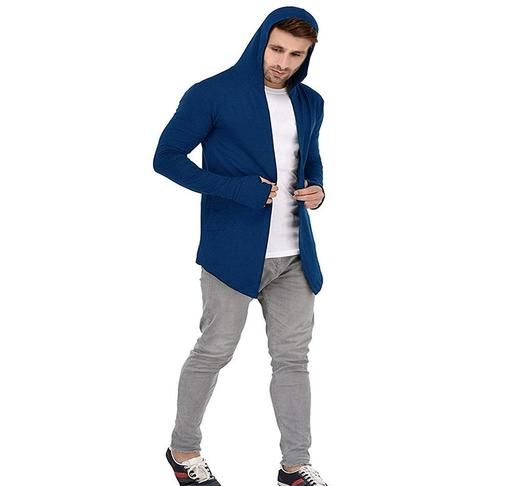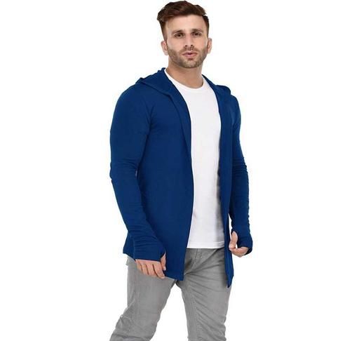 Name: Men Royal Blue Hooded Thumbhole Open Long Cardigan Overcoat Shrug Men's Casual Solid Cotton Square Neck Collar Full Sleeves Cardigan Overcoat/Shrug