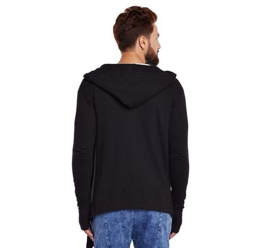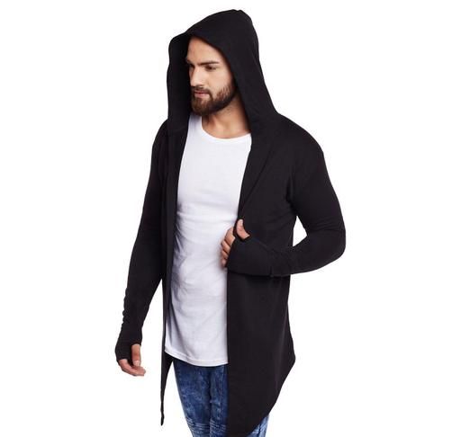 Name: Men Black Hooded Thumbhole Open Long Shrug Men's Premium Solid Cotton Square Neck Collar Full Sleeves Cardigan Overcoat Shrug