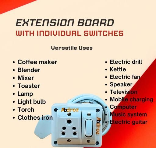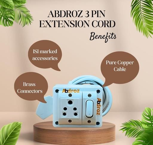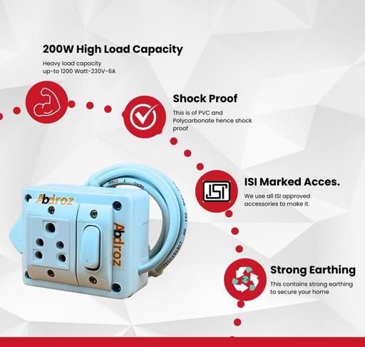 ABDROZ 3 Pins Extension Cord with Individual Switch is built with 1 switch and 1 socket of 6A. It can take load up to 1200 watts. It is very useful for your home appliances of low wattage like mobile charging, computer, bulb, table fan, ceiling fan, LED light, decorative lights etc. It is built up with ISI marked accessories and pure copper cable.