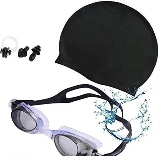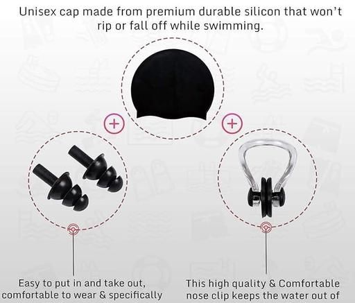 Name: SPOCCO | Swimming Goggles, Caps Combo Set With Nose Clip, Ear Plug - Free Size Swimming Cap (Black, Pack of 1)