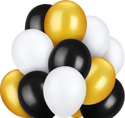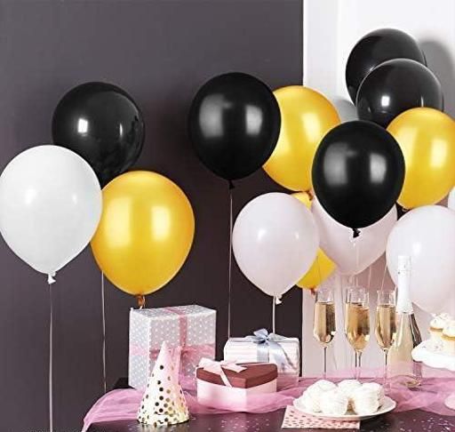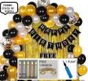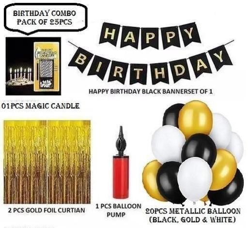 Package included =(25Pcs) 01pcs Happy Birthday Black Banner + 2 Golden Curtain + Golden Black & white Hd Metallic Balloon Pack Of 20 + And 01pcs Megic Candle + 01pcs Pump Free For Decoration Item