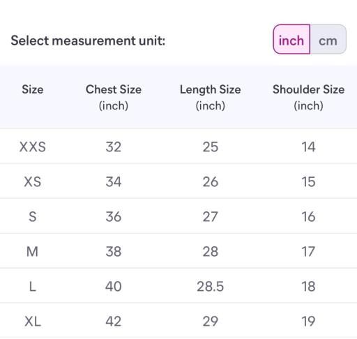 XS (Chest Size: 34 in, Length Size: 27 in)