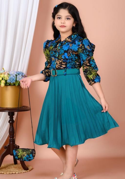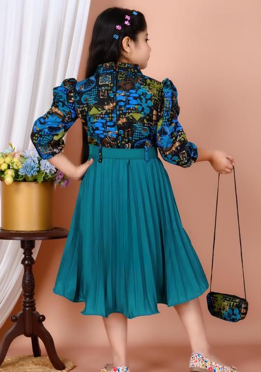 Name: New stylish floral Baby Girls Dress/Frocks , with same design Bag and Belt Perfect Kids Frock | teal and black abstract print, A-line silhouette, pleated skirt, belted waist, A-line, one-piece, pleated dress, pleated skirt, belt, buttons, puff sleeve, polo/collar, belted, curved, above knee, Girls, partywear, all-season, belt, purse