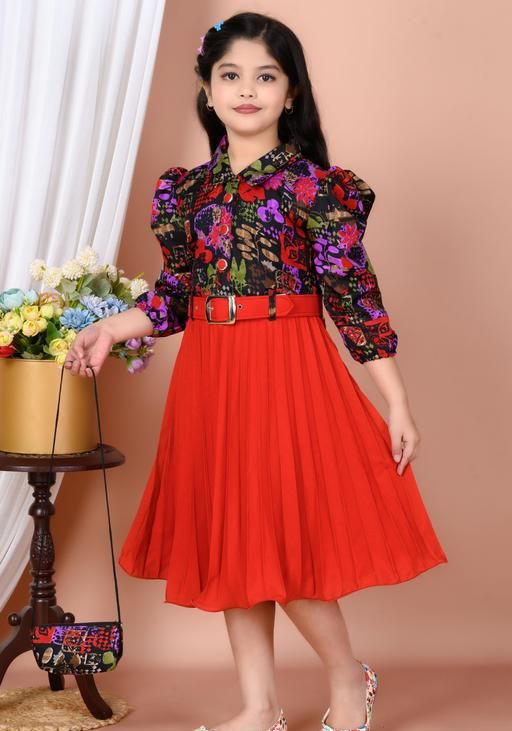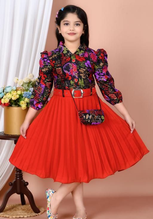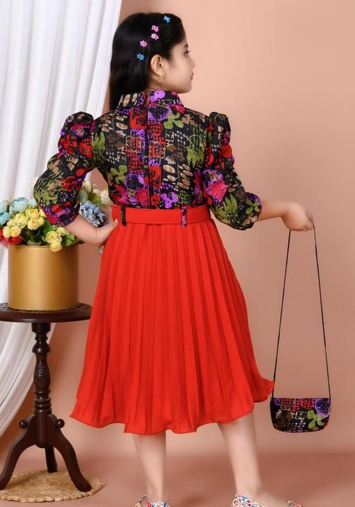 Name: New stylish floral Baby Girls Dress/Frocks , with same design Bag and Belt Perfect Kids Frock | multicolor floral print (top), red solid (skirt), A-line silhouette, two-piece design (top and pleated skirt), fitted bodice, flared skirt, A-line, one-piece, pleated dress, pleated skirt, belt, buttons, puff sleeve, polo/collar, belted, curved, above knee, Girls, partywear, all-season, belt, handbag