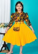 New stylish floral Baby Girls Dress/Frocks , with same design Bag and Belt Perfect Kids Frock | multicolor floral print (top), red solid (skirt), A-line silhouette, two-piece design (top and pleated skirt), fitted bodice, flared skirt, A-line, one-piece, pleated dress, pleated skirt, belt, buttons, puff sleeve, polo/collar, belted, curved, above knee, Girls, partywear, all-season, belt, handbag