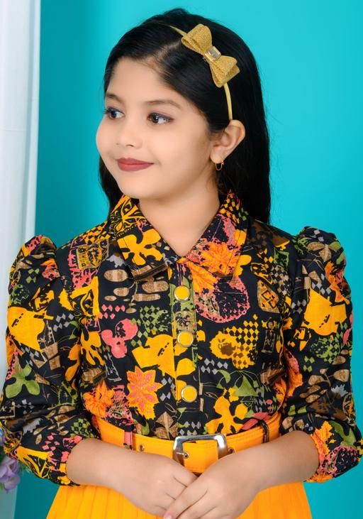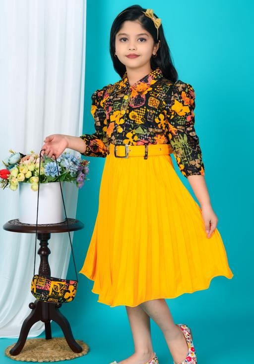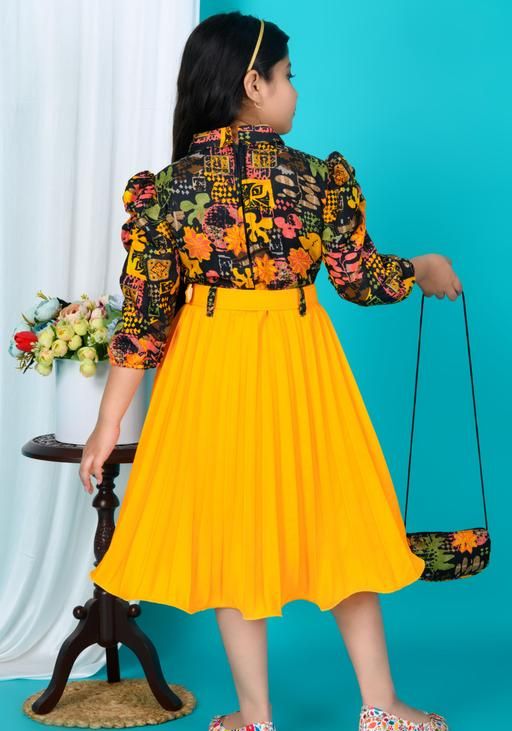 New stylish floral Baby Girls Dress/Frocks , with same design Bag and Belt Perfect Kids Frock | yellow and black floral print, floral print, A-line silhouette, two-piece dress, pleated skirt, belted waist, bows, A-line, one-piece, pleated dress, pleated skirt, belt, buttons, puff sleeve, polo/collar, belted, curved, midi, Girls, belt, purse, headband