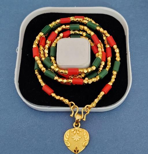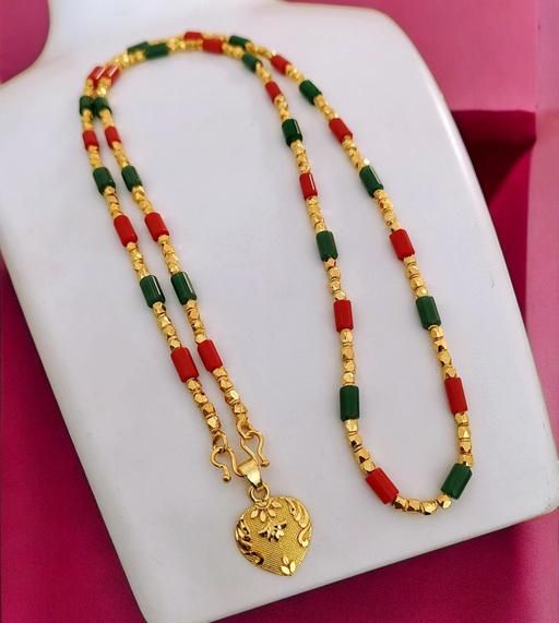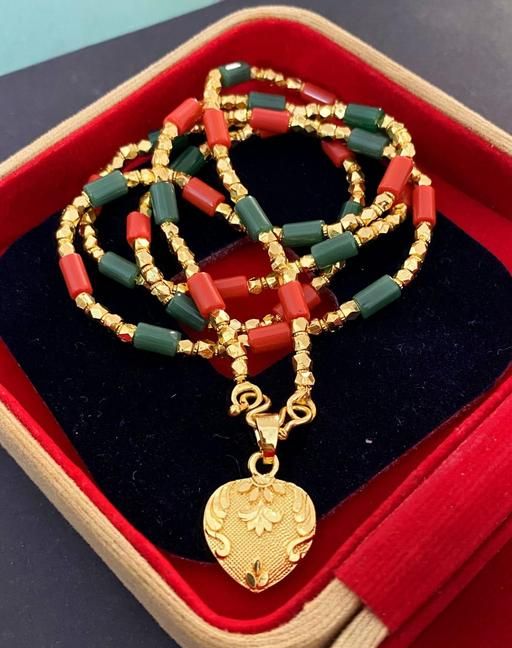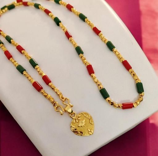 Name: One Gram Gold Plated Corel Red Green Beads Necklace Chain Mala With Doller Heart Pendent 28 Inch Long For Women