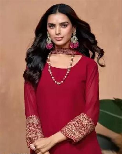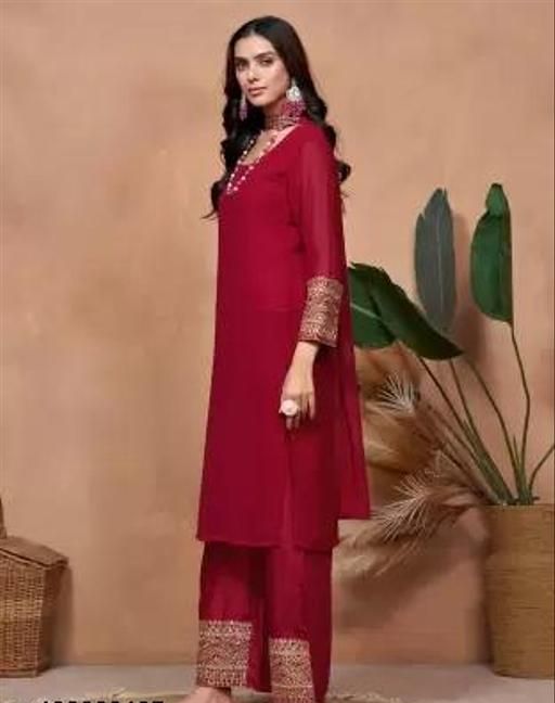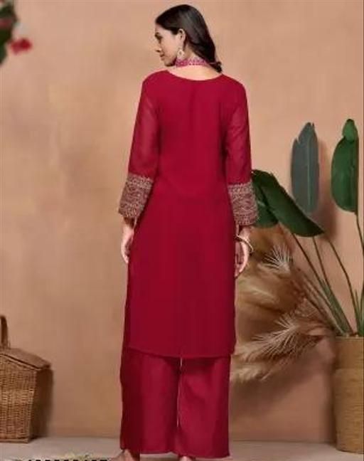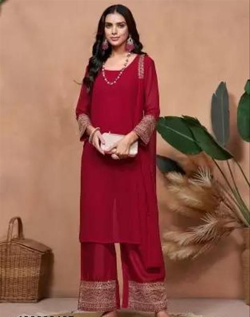 Featuring Traditional Design With Modern Style,This Cherry Georgette Straight kurta Palazzo And duapptta Set and Lace Work kurta Palazzo and duapptta a c